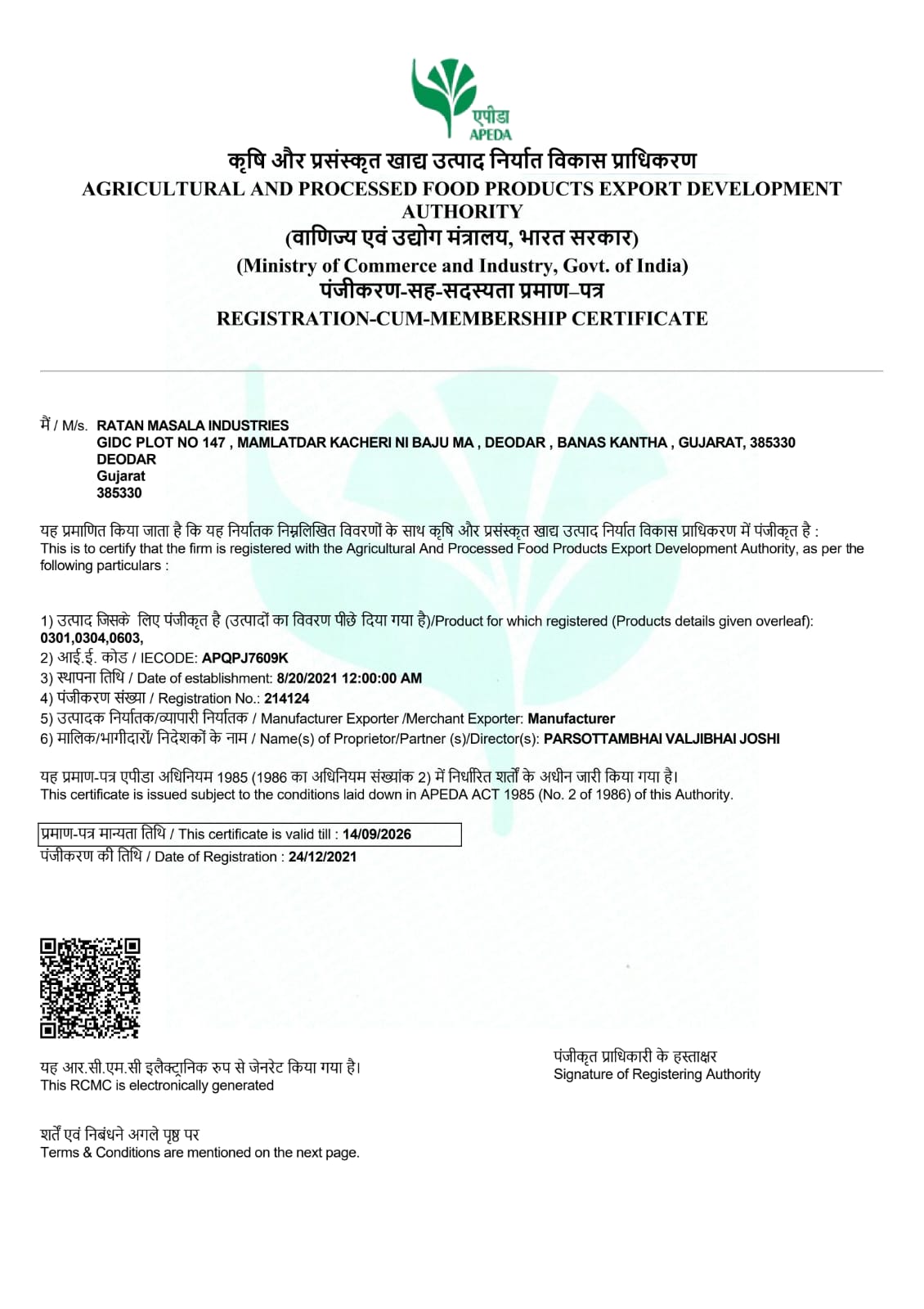 Registered with Agricultural & Processed Food Products Export Development Authority for export of food products.