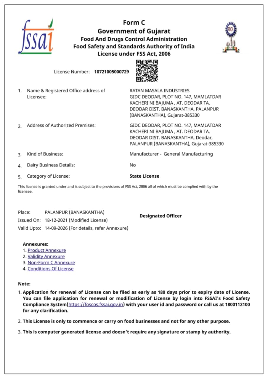 Licensed by Food Safety and Standards Authority of India for food manufacturing operations.