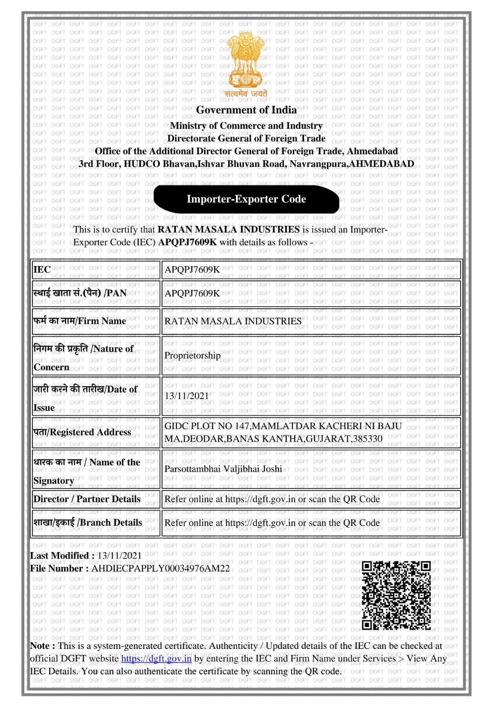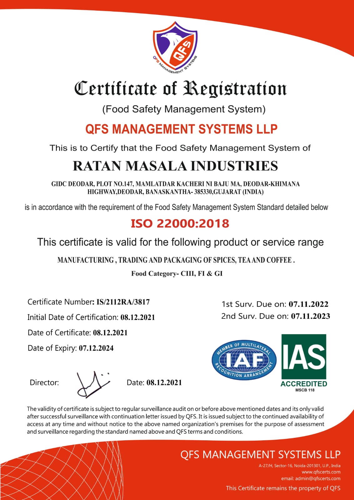 Certified Food Safety Management System for manufacturing, packaging and trading of spices.