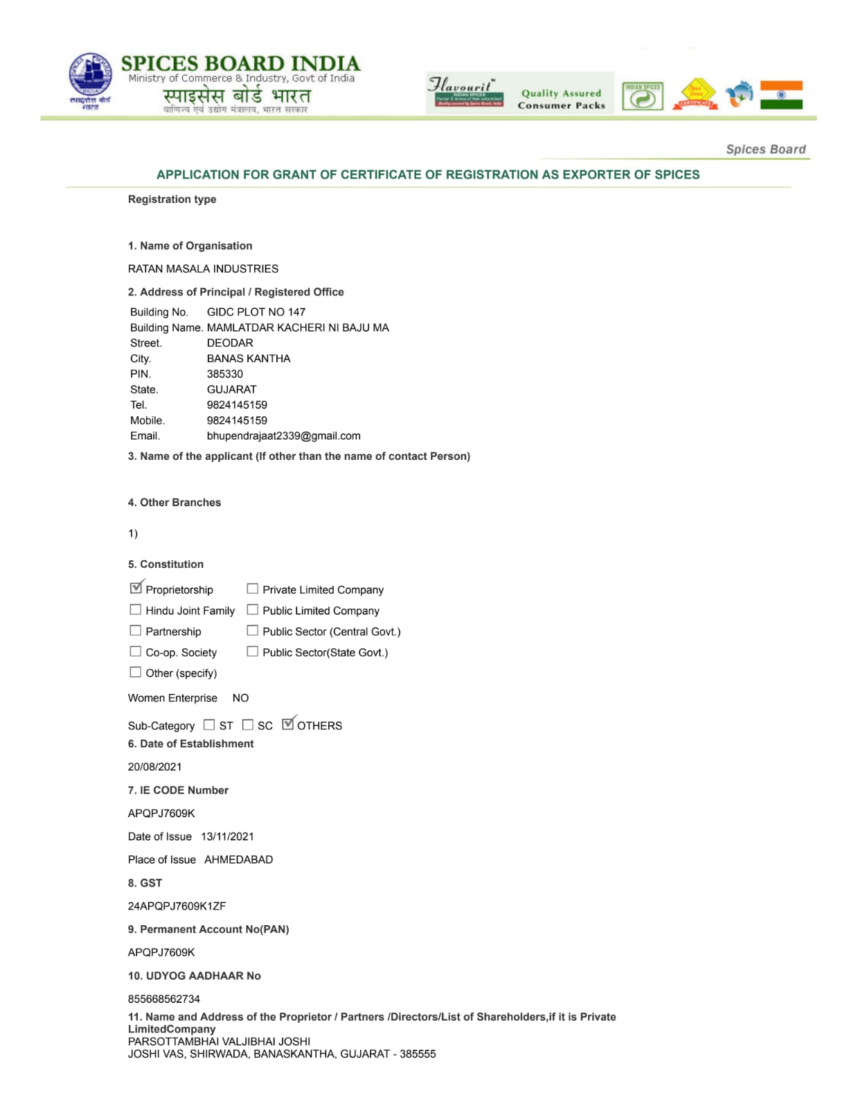Registered with Spices Board of India, Ministry of Commerce for spice export compliance.